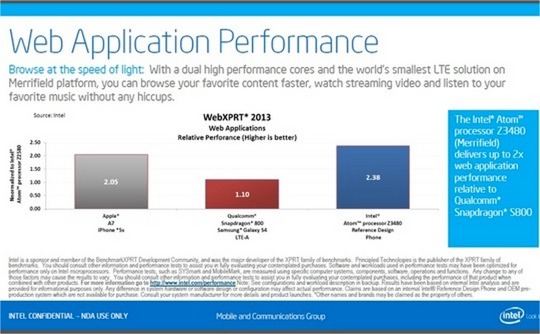 در عکسی که در زیر مشاهده می فرمایید پردازنده جدید اینتل با نام Z3480 با A7 و Qualcomm S800 مقایسه شده و به وضوح دارای قدرت بیشتری از این 2 پردازنده خوش نام حال حاضر دنیاست.